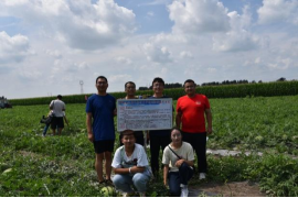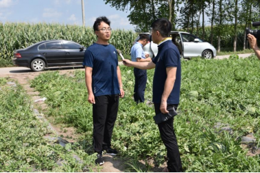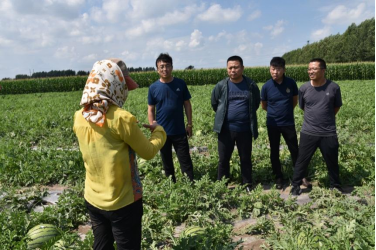 2021年7月22日,金沙集团1862cc成色杨凤军院长、靳亚忠副教授、院综合办主任张吉以及农学院张有利副教授,带领研究生徐常建、熊亚男以及本科生段志永来到肇州县永胜乡丰产村后二井子屯西瓜种植基地进行了露地西瓜现场观摩会以及露地西瓜绿色富硒栽培技术调研、西瓜销售调研等活动。永胜乡党委书记杨飞书记、肖国锋乡长带领乡村领导和部分西瓜种植户共同参与调研和观摩。