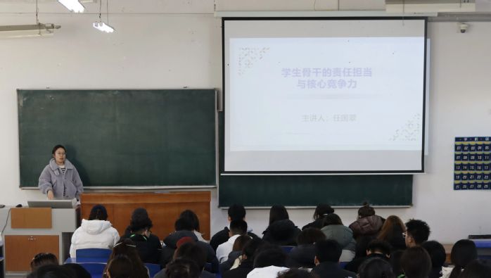 学院党委副书记徐娟从学生骨干的角色和定位、学生骨干应具备的素质和能力、学生骨干应该注意什么、学生骨干怎样保持饱满的工作热情四个方面,结合多年工作经验对学生组织工作进行梳理。提出学生骨干们应通过专业学习提升能力,以更坚定的信念、更昂扬的斗志,在青春路上绽放光芒,用过硬本领担当起时代赋予青年的使命与责任。